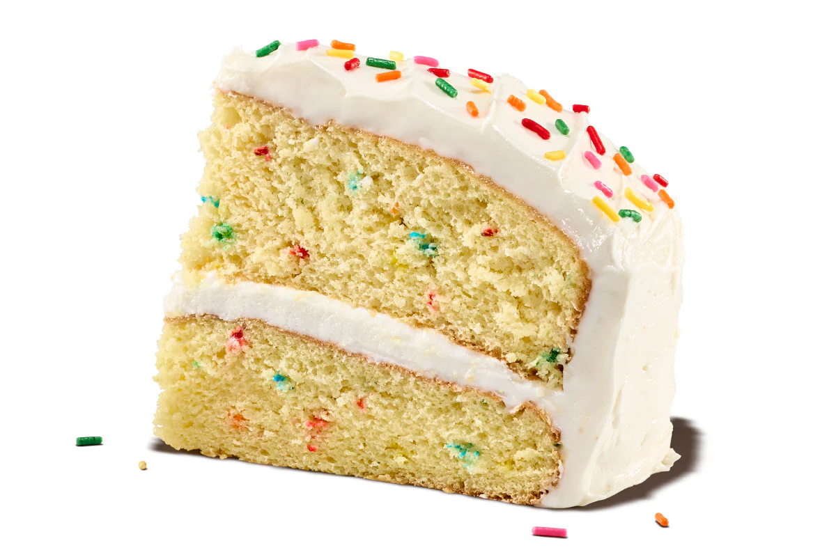 A slice of rich, melt-in-your-mouth cake packed with rainbow sprinkles and creamy vanilla icing. It’s the classic birthday flavor you loved as a kid! Only available thru 4/6. Made in collaboration with Funfetti!